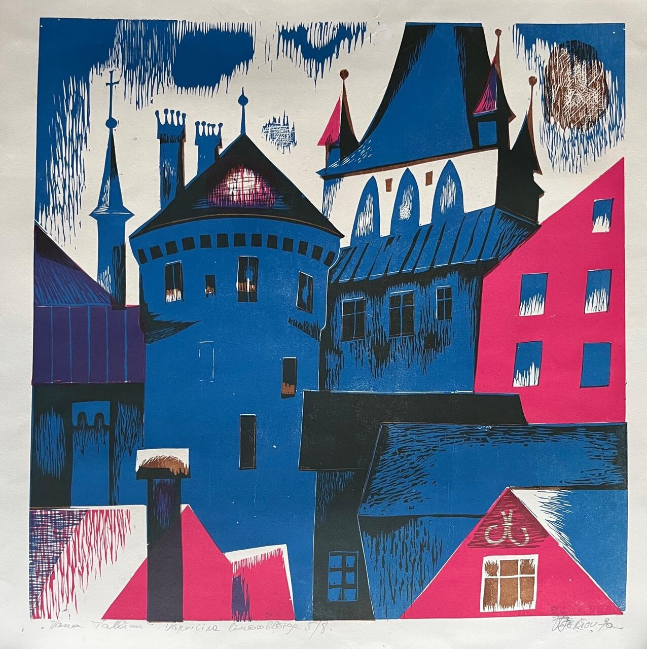 Värviline linoollõige 1970, 5/8, raamimata, plaadi mõõdud 41 x 41 cm.