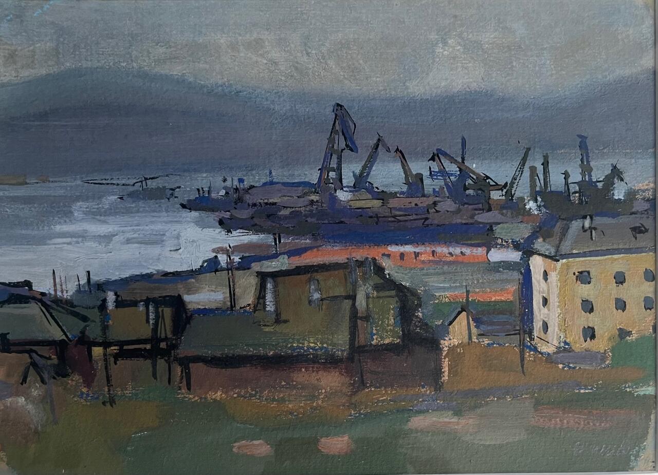 Tempera, guašš papil, 1958. Signeeritud ja raamitud. Ava mõõdud 24,5 x 34,5 cm.