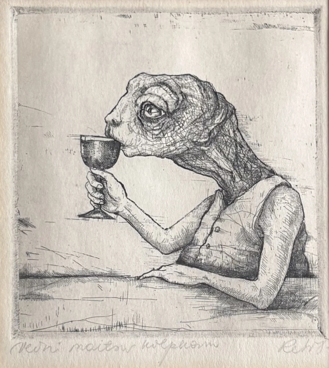 Ofort 1987, signeeritud, originaalraamiga. Ava mõõdud 8,5 x 9,5 cm, raami mõõdud 16 x 18 cm.