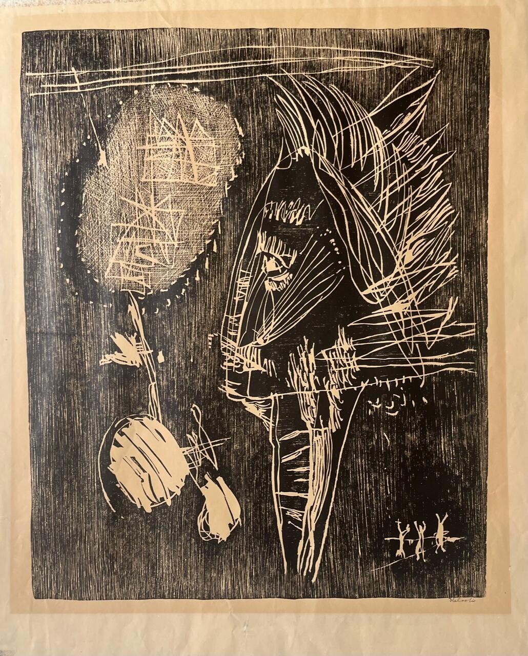 Puulõige aastast 1950. Kujutise mõõdud 46 x 38 cm. Raamimata, leht on kolletunud.