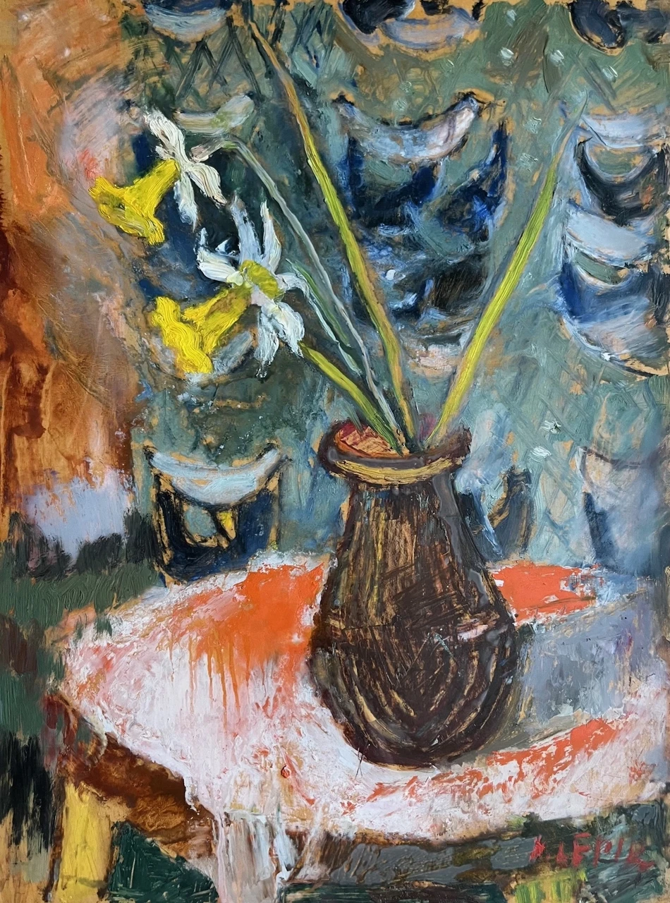 Õlimaal papil, raamitud, signeeritud. Kujutise mõõdud 35 x 47, mõõdud koos raamiga 49 x 64 cm.